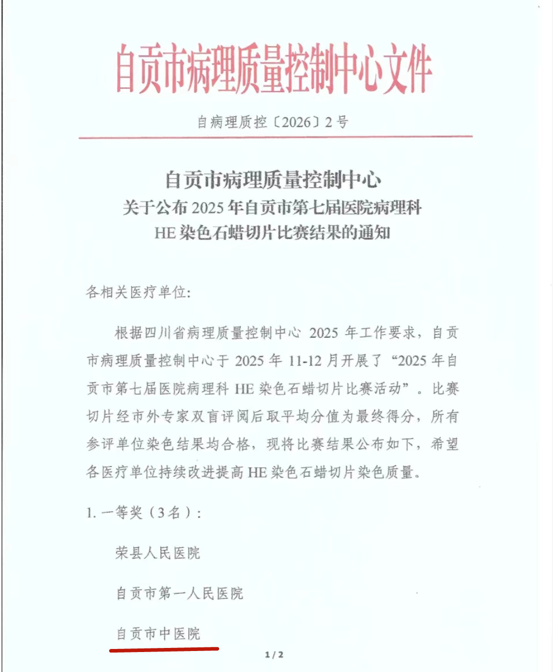 近日,在自贡市第七届医院病理科HE染色石蜡切片比赛中,市中医医院病理科杨宗梅脱颖而出,荣获一等奖。