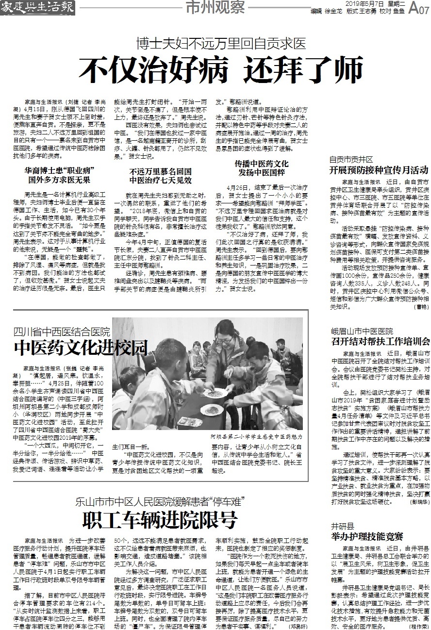 家庭与生活报:博士夫妇不远万里回自贡求医 不仅治好了病 还拜了师