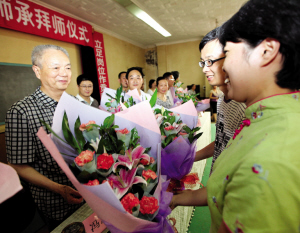 本报讯(记者 熊心权)21日,市中医院举行隆重的名老中医收徒拜师仪式,冯志荣、高冰、何爱国等9名国家、省、市名老中医收徒10名。这10名弟子均为近几年刚刚走出大学校门的年轻医师,他们都具有中医和临床医学的硕士和本科学历。在拜师仪式上,师徒宣读了拜师帖和师训。