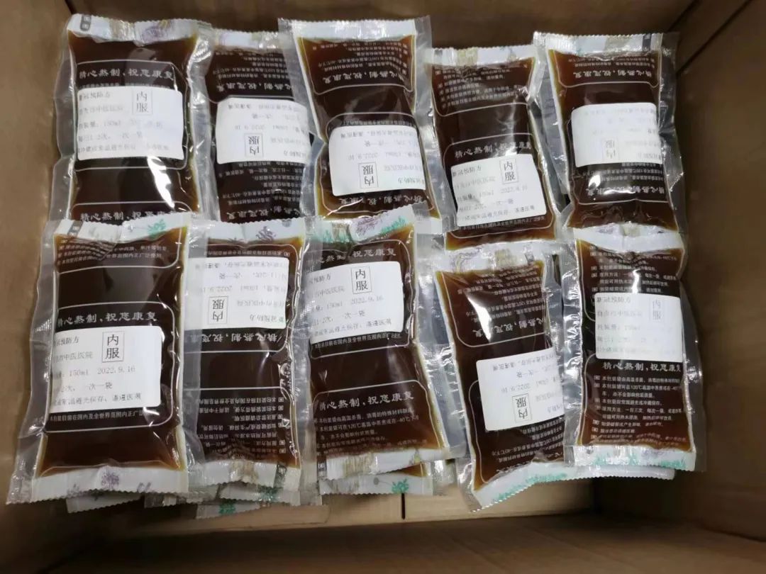 自贡市中医医院闻令而动,迅速抽调人员,组建党员先锋队,调集中药饮片,全力以赴开展“大锅汤”的熬制。制剂室现场,配药、熬制、分包、装箱……药剂科医务人员分工明确,加班加点,及时将首批100箱共计1万袋中药“大锅汤”打包装车,连夜发往内江,第一时间将热腾腾的中药汤剂发放到内江市民手中。