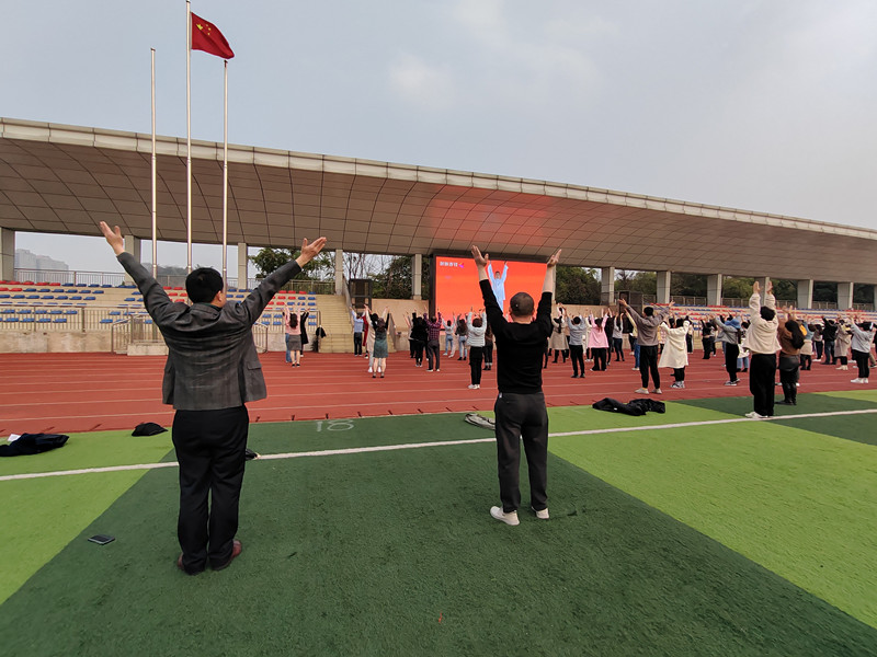 养生操教学在学校操场进行,学校近200名教职员工参加。中医养生功法八段锦作为我国传统养生功法,八个动作简单易学,能提高人体免疫力,适合广泛推广。儿科李蓝轩医师将功法的动作要领和功效做了详细讲解与示范,老师们认真跟学练习,并表示自己学习后将利用课余时间传授给孩子们。