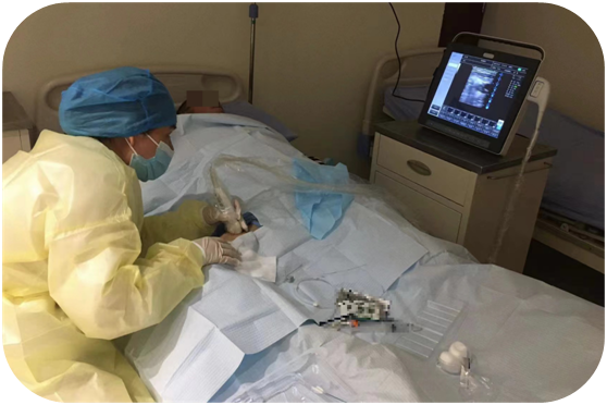 然后变换探头方向,沿大腿横轴观察拟刺入静脉的横断面,评估穿刺针预期的行走路径,以保证穿刺针顺利进针,绘制从静脉穿刺点到预期皮肤置入部位的路径,行皮下隧道穿刺术,准确刺入血管并观察回血情况。送入导引导丝,改良式无创扩皮法,送入微导入鞘(送管通道),送导管,固定,下肢一针式隧道式PICC置入术顺利完成。