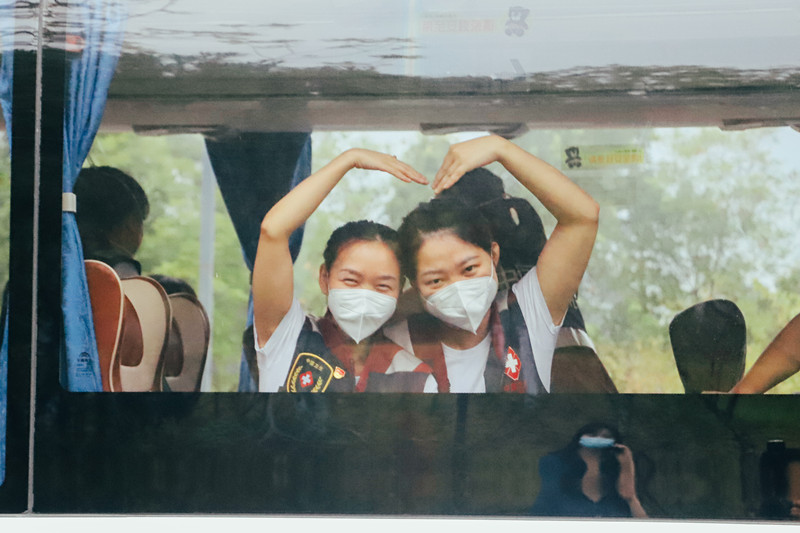 第二天清晨,随着大巴车的启动,应急支援队伍再次踏上了征程,隔着大巴车车窗,队员刘英洁和队友林凤向前来送行的同事和家人比出一个心型,只为让“大家放心”。