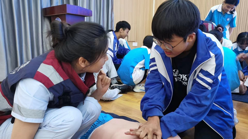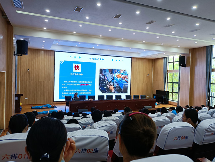 急诊科医生何静芳、吴海等将枯燥乏味的急救知识通过简单易懂的方式,利用图文并茂的形式为现场的师生们讲解心肺复苏、AED操作、海姆立克急救法等应急救护的专业知识。