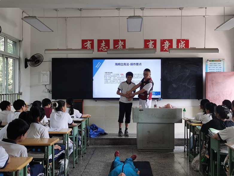 护理人员进行了实际操作步骤的演示。学校师生们对于这种新颖的教学模式表现出非常大的热情,在互动环节,基本掌握了心肺复苏、AED、海姆立克、溺水急救的操作方法。