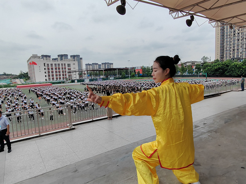 在医院2名护理老师的带领下,学校2000余名师生一起了演练“八段锦”养生操。