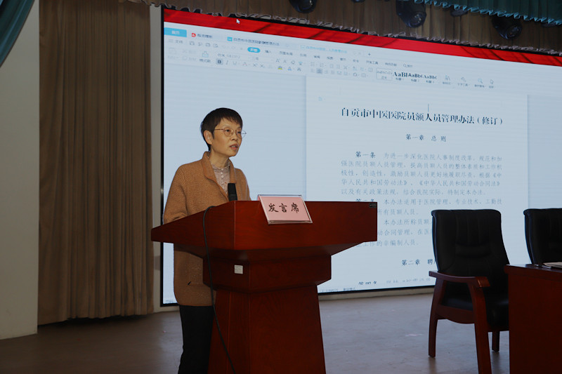 党委副书记、工会主席魏雪飞宣读《自贡市中医医院员额人员管理办法(修订)》《自贡市中医医院薪酬管理办法(试行)》并作说明。