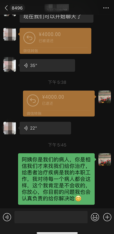 为了表达对医护人员的精心照顾及精湛医疗的感激之情,江阿姨出院时转发4000元给护士长文小兰表示感谢。文小兰谢绝了江阿姨的红包,她说:“您的理解和信任胜过任何馈赠,给患者治疗疾病是我的本职工作,我对待每一个病人都会这样。”