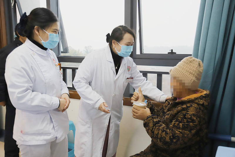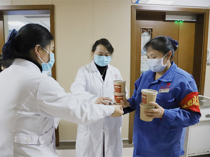 “谢谢你们!没想到你们这么记挂着我!这腊八粥很适合我们的口味。也祝愿你们医护人员平安健康。”一位患者拉着医护人员的手微笑着说。