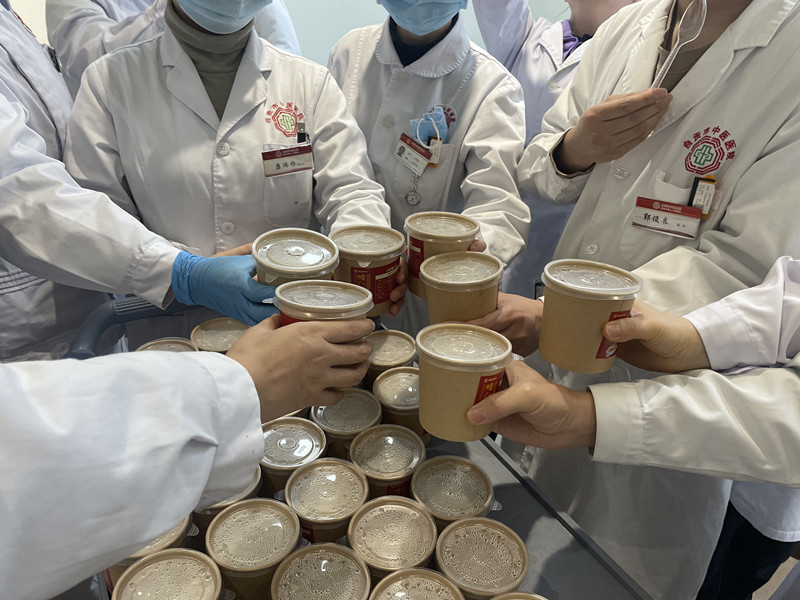 此次熬制的腊八粥,为医院营养科在传统腊八粥的基础上,精心改良调配,并根据患者的情况配置了含糖和不含糖两种口味,具有扶阳补气的效果,得到了大家的一致好评。