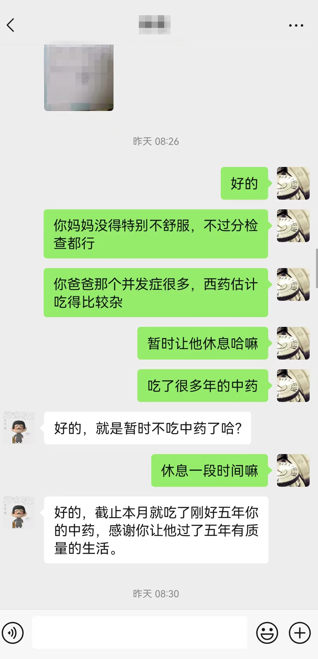 经过几个月的治疗后,林父复查显示,各项指标均得到明显改善。这无异坚定了林女士一家信心,谨遵医嘱坚持治疗。因林女士父亲所患多种疾病,担心父亲感冒、受凉、摔倒......希望医生能随时给予指导,热情的杨玉玲便将自己得电话留给了林女士,并加了微信。