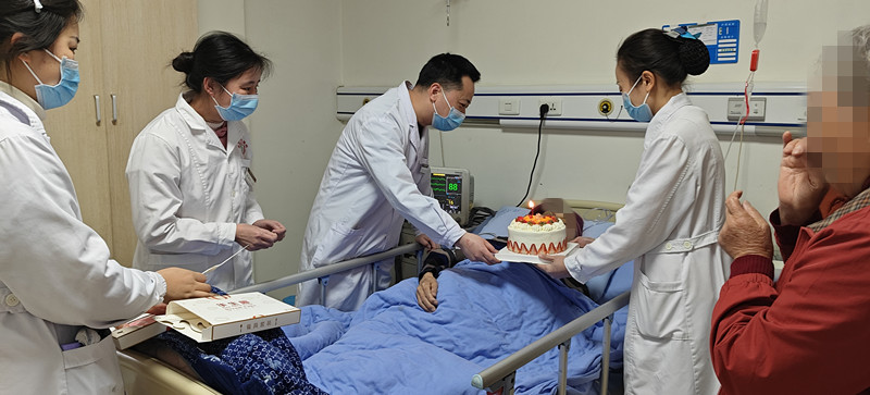 患者旷大爷因水肿住院,住院期间,科室医护人员根据旷大爷的病情制定了详细的治疗方案和护理措施。细心的护士长陈丽得知了旷大爷即将迎来74岁的生日,便提前预订了生日蛋糕,准备为他举行一个温馨而有意义的生日,尽最大的努力使患者感受到家庭般的温暖。
