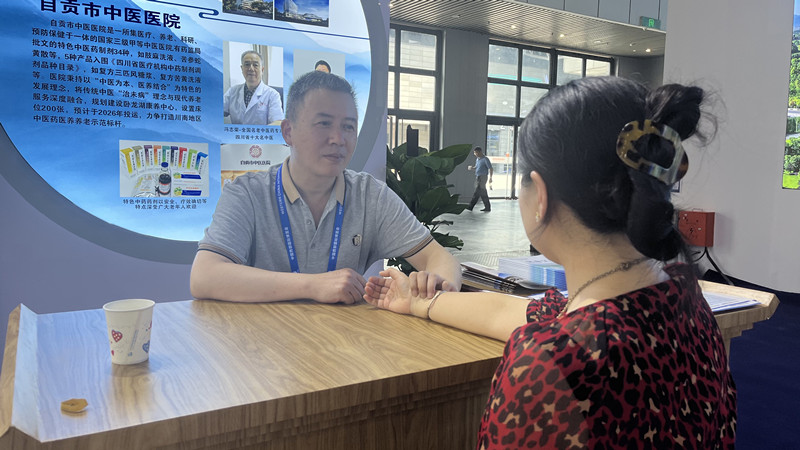 作为自贡市唯一一家参加老博会的医疗机构,市中医医院院内制剂、大健康产品在展区展出。现场,主任中医师罗文坐诊,引来无数中医爱好者把脉问诊。医养结合中心副主任李碧洪,向大家介绍了医院医养产业的发展情况。