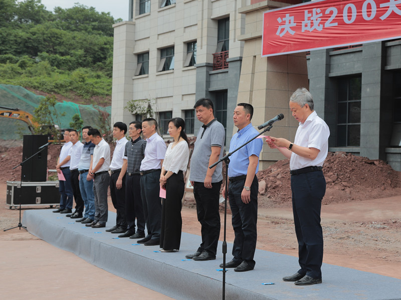 “决战200天,用激情成就梦想;决战200天,用汗水铸就辉煌……”6月14日,市中医院在卧龙湖康疗中心举行了“决战200天,共建一个现代化中医院”为主题的卧龙湖康疗中心一期工程项目建设誓师大会。高新区管委会副主任、卧龙湖国际旅游度假区建设指挥部指挥长吴开洪,市卫健委调研员虞贵兴,沿滩区卫健局局长丁俊,院党政领导班子、中层干部、职工代表以及施工单位、合作共建意向单位代表200余人参加誓师大会。大会由党委书记陈彬主持。