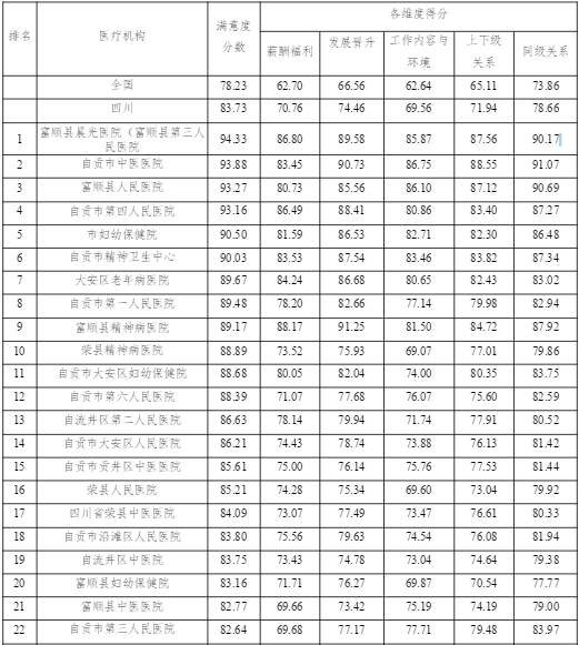 全省员工满意度平均水平为83.73。市中医院员工满意度93.88,排名全市第二。调查结果显示,我市员工满意度各项分维度得分从高到低依次为:同级关系、发展晋升、上下级关系、薪酬福利、工作内容与环境。