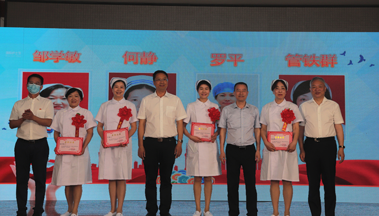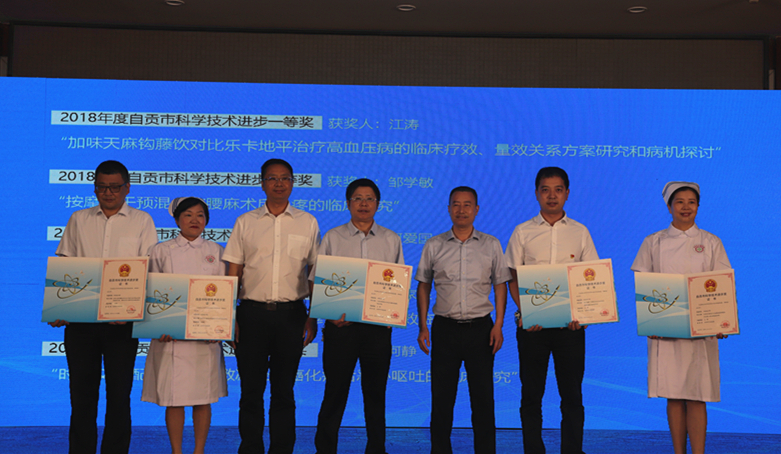 朱柱局长、黄麟主任分别为医院荣获2018-2019年度自贡市科学技术进步一等奖(协研)、三等奖的获奖人员代表颁奖,并向4名30年护龄的护理人员颁发荣誉证书。