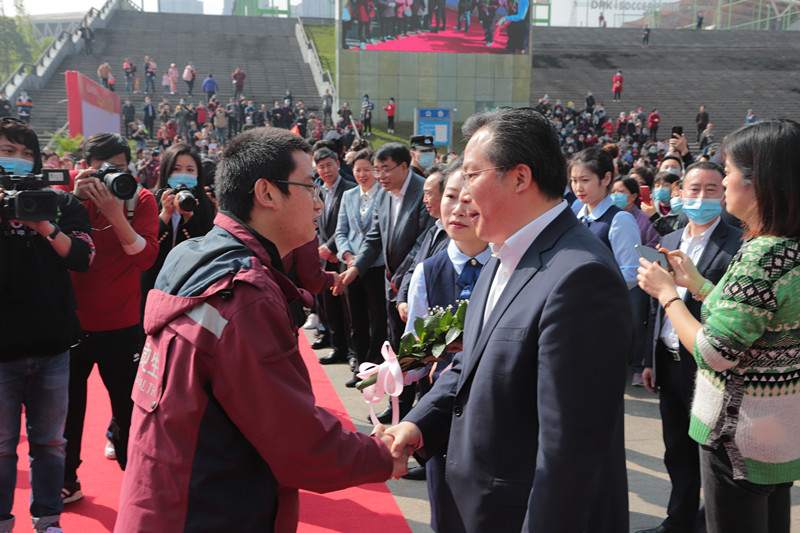 警车开道!铁骑护卫!上午10时许,第一批凯旋的援湖北医疗队员20人乘坐专车抵达南湖体育中心北门广场。市委书记范波,市委副书记、市长何树平带队等候迎接,向每一位队员送上鲜花,并颁发荣誉证书,对医疗队员回到家乡表示热烈欢迎和崇高敬意。