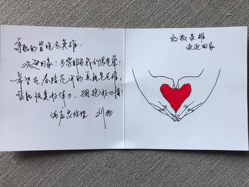 50多天来,我们共同见证武汉人民的付出和牺牲,医务工作者的坚持和坚守,更见证了我们伟大祖国在面对困难和危机时所展现的动员能力和大国担当。感谢省、市领导对我们的鼓励和支持,感谢市卫健委及院领导对我们的关心和关爱,感谢给我们提供物资援助的企业及个人,感谢驻地领导及工作人员对我们的细心服务,我们一定不辱使命,平安归来。