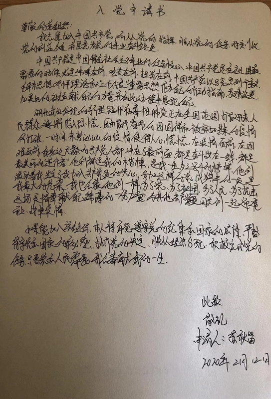 近日,我院第二批援鄂医疗小分队队员曾晓冬、苏秋笛先后写下入党申请书,希望早日成为一名光荣的共产党员,为人民健康事业贡献自己的力量。