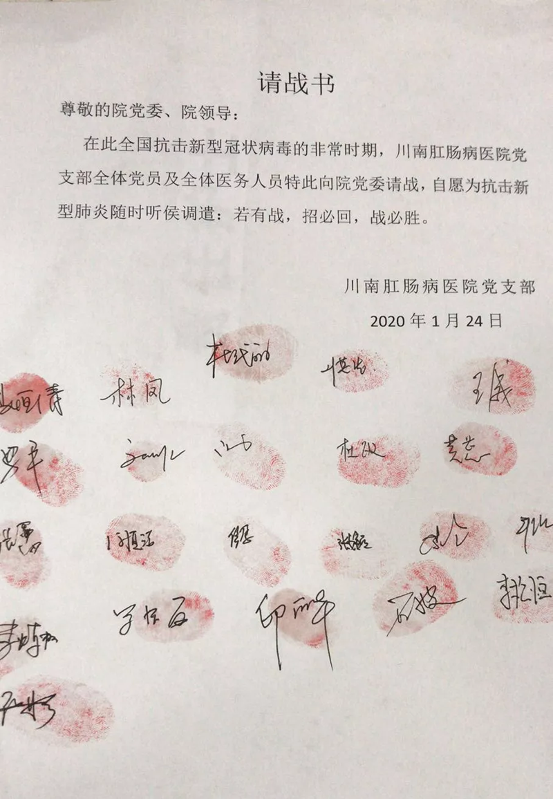 1月24日晚,市中医医院党委收到了一封来自川南肛肠病医院党支部的《请战书》,支部全体党员签字摁下了红手印向院党委请战,自愿为抗击新型冠状病毒随时听候调遣。虽只有短短百余字,已尽表抗击疫情决心和必胜信心。
