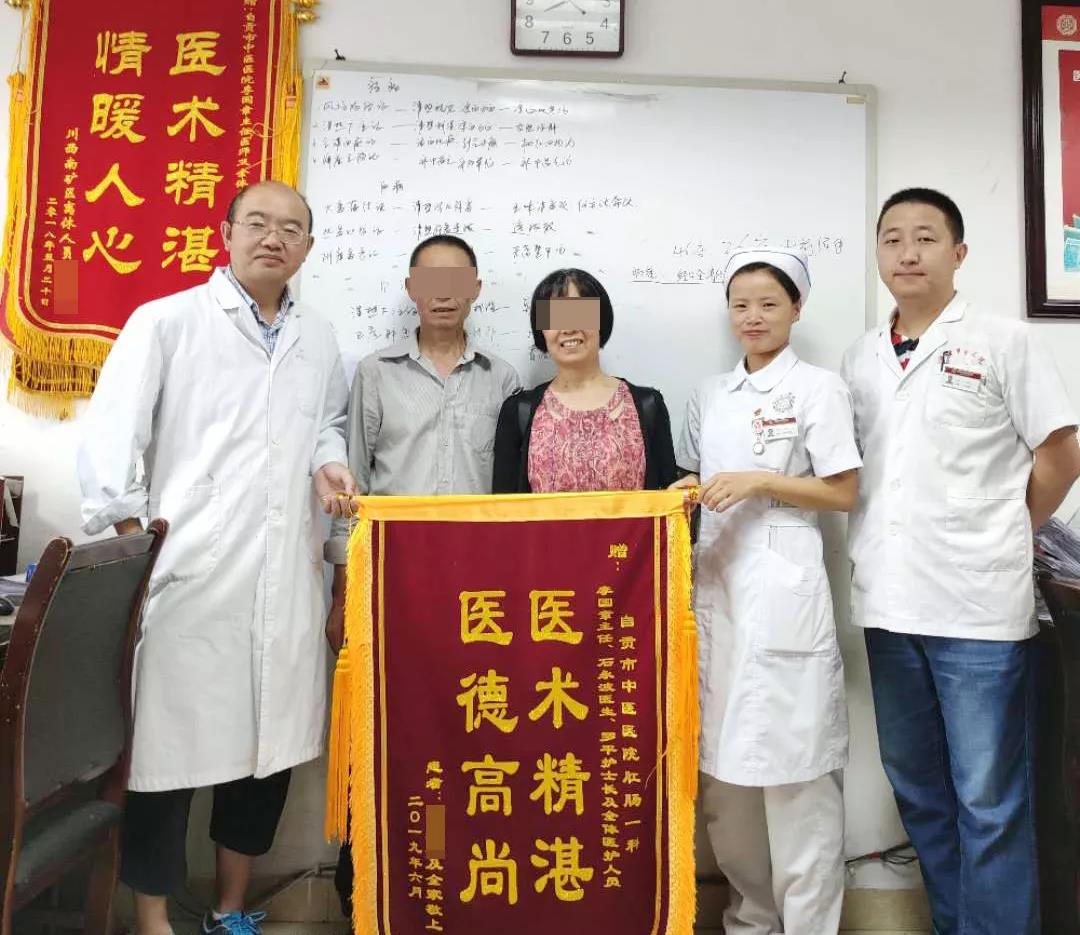 6月27日早上8点,曹阿姨和老伴的到来,打断了自贡市中医医院肛肠一科医护人员的交接班,已出院半个多月的曹阿姨从20余公里外乘车专程到访,不为别的,只是想将一面印有“医术精湛,医德高尚”的锦旗亲手送到医护人员手中,以表感谢之情。