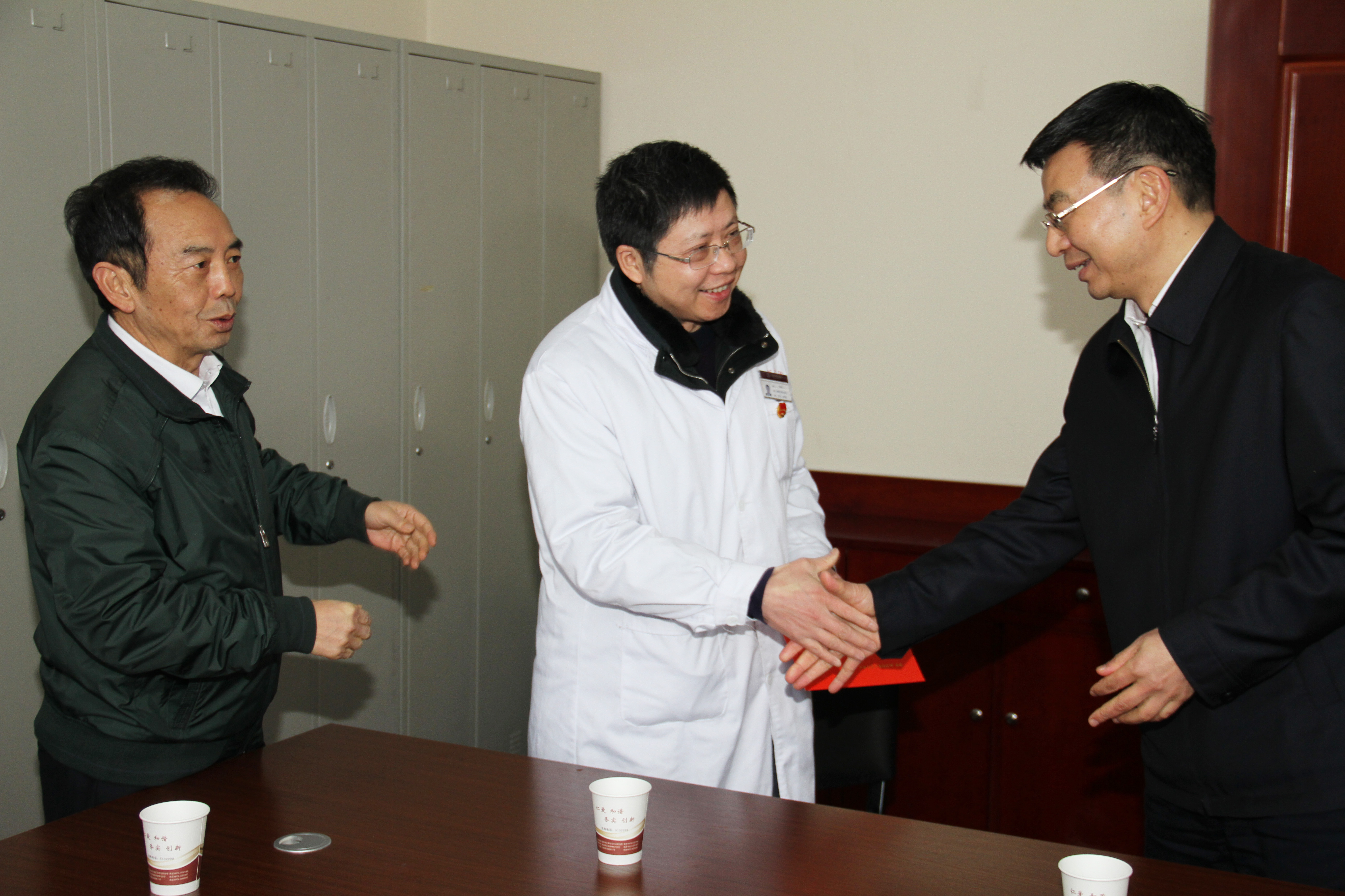 1月31日,市政协主席游开余,市委副书记李国贵、市人大常委会副主任胡开洪,市政府秘书长黄雪智以及市民政局、市总工会等部门负责人来到我院慰问肿瘤、血液科主任,全国卫生系统先进工作者、四川省名中医、四川省优秀共产党员何爱国主任医师。