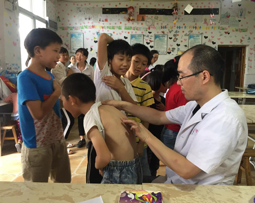 活动当天,支部全体党员冒着36℃高温来到位于大安区新胜乡的杰克森关爱中心,与孩子们温馨的交流之后,特意为58名儿童送上了321本健康积极向上的课外书籍和10套床单、被套、枕套。随后,支部医生党员为孩子们进行了身高、体重、视力的测量以及脊柱健康筛查、内科常规查体及心理干预六项健康检查。同时为诉有头痛等不适的两名女孩开展了针灸治疗,为一位脾胃较差的孩子进行了穴位按摩干预。