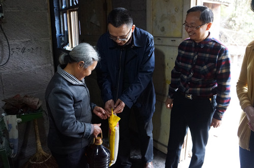 21日上午,由医院党委书记熊骥带队,副院长王荧、郭永清及相关职能部门负责人一行6人分别走访了联系的大安区回龙镇狮子村和何市镇阮家村的计划生特殊家庭以及牛佛镇祝家村精准扶贫户,为他们送去了食用油、大米等生活用品。在回龙镇和何市镇,院领导详细了解了两个计划生育特殊家庭情况和生活状况,熊书记指出,失独家庭不仅要得到党和政府的关怀,作为联系单位,更应该了解他们的实际困难,为改善他们的生活条件提供帮助。