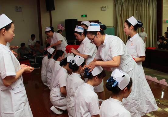 随着音乐声的响起授帽仪式正式开始,20位年轻护士由护理前辈为她们戴上圣洁的燕尾帽,接过前辈手中的红烛,向南丁格尔宣誓,将毕生精力奉献给护理事业……。