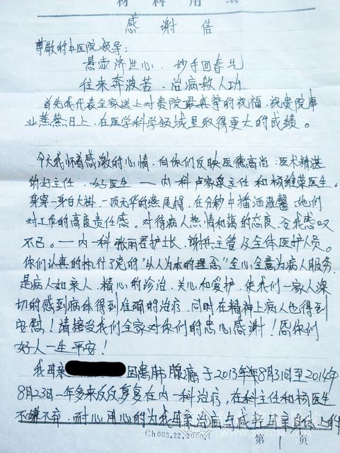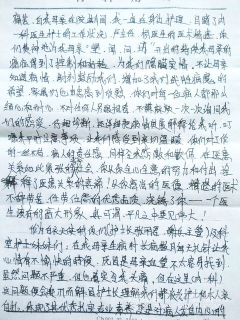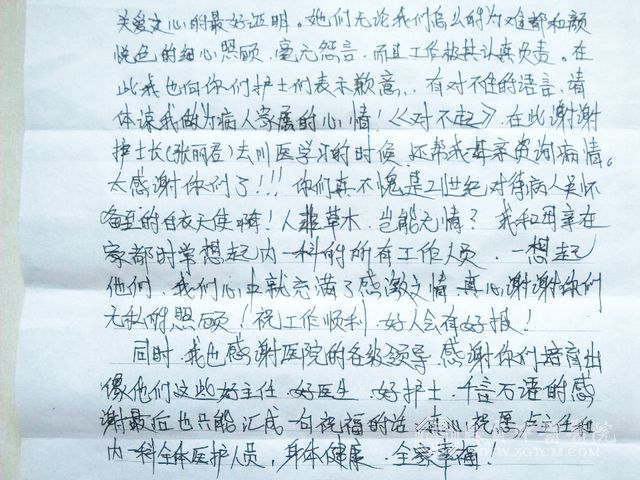 患者家属致内一科全体医护人员的感谢信
