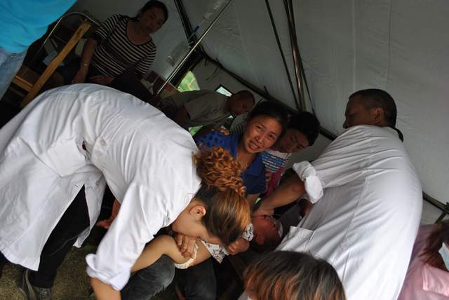韦汉才主任一到临时医疗点,顾不上休息,马上就向当地医务人员了解工作情况。由于近期灾区连续高温,昼夜温差达20多度,有不少感冒发烧患儿。正在这时,有一名高热惊厥的患儿被送来,患儿母亲哭诉说:“患儿发烧两天多了,刚才出现四肢抽搐,口吐白沫,神志不清的情况,请医生快救救孩子”, 韦主任马上掐住患儿的人中和合谷穴,并配合酒精物理降温,几分钟后,患儿抽搐逐渐得到缓解,并且也恢复了意识,哭出声来,家属紧皱的眉头也舒展开来。随后,韦主任又为患儿进行了检查,发现其肺上有感染,由于当地医疗条件有限,他立即请示医疗点指挥长,将患儿迅速转至雅安地区医院。患儿转走后,韦主任又投入其他患儿的诊治工作中。