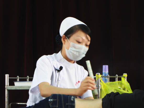 此次护理操作示范的人员均来自中医护理特色科室中的骨干人员,他们轮流示范了拔罐法、穴位按摩法、毫针刺法、中药灌肠共5项中医护理技术。培训现场,首先由示范人员将临床工作中总结的中医护理经验和技巧整理成文字,与大家分享,使大家更系统地了解并掌握了各项护理技术操作的理念、操作流程、沟通技巧及相应的注意事项。随即进行现场操作示范,加深印象,使理论与实践得到有机结合。她们娴熟流畅的操作示范获得了现场观演者的声声赞许。示范结束后,针对操作中存在的疑问,大家展开了激烈讨论,护理部主任吴萍针对大家争议的事项进行了统一。