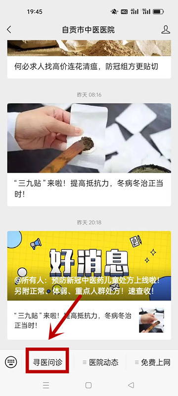 流程:关注微信公众号“自贡市中医医院”-寻医问诊-预约挂号-网络门诊-选择相应医师-等待医师电话-开具处方-网上缴费。(免挂号费,防冠中药或香囊购买6付及以上可享受市内包邮到家;市外或数量不足6付可到付,费用根据快递公司结算为准)