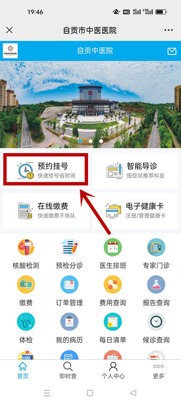 1.关注自贡市中医医院官方微信公众号,点击下方“寻医问诊”。