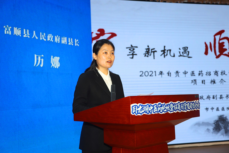 富顺县人民政府副县长历娜、市中医医院院长邓昭红、自贡彩灯文化传播运营有限公司副总经理钱虹、自贡市老年康养产业协会会长曾姝分别作招商推介。市中医医院院长邓昭红代表医院,重点推介了医养结合服务中心项目、技术服务合作项目以及中医药文化旅游服务项目。