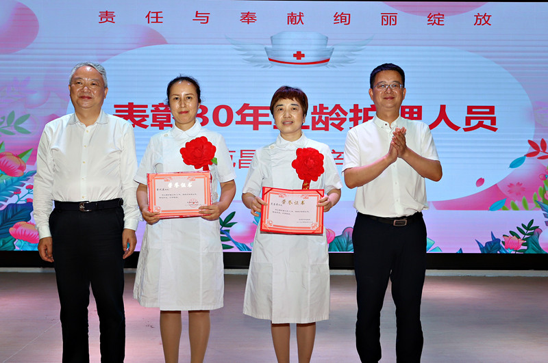 党委书记陈彬、院长邓昭红为“30年工龄护理人员” 范昌莉、幸代英颁发荣誉证书。