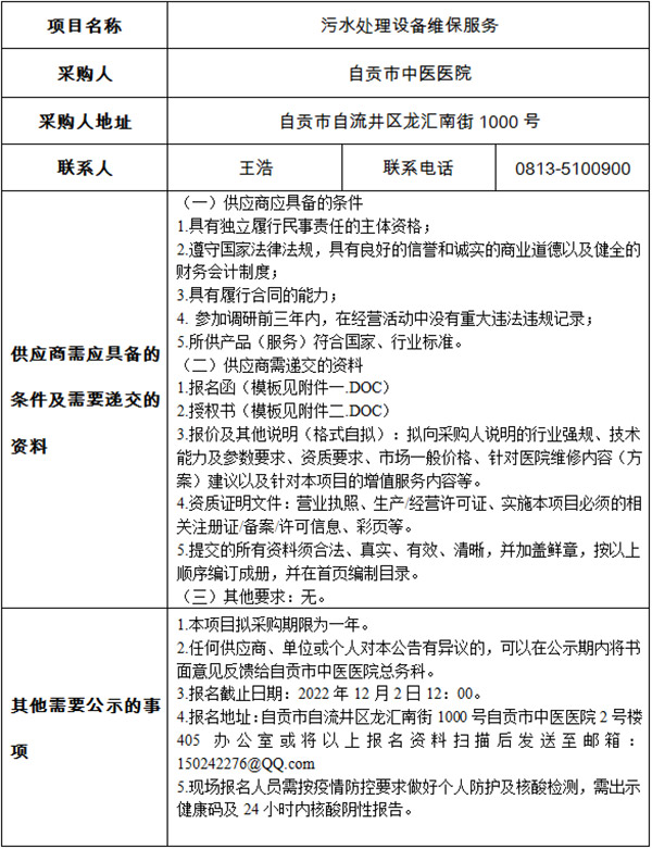 自贡市中医医院污水处理设备维保服务市场调研公告